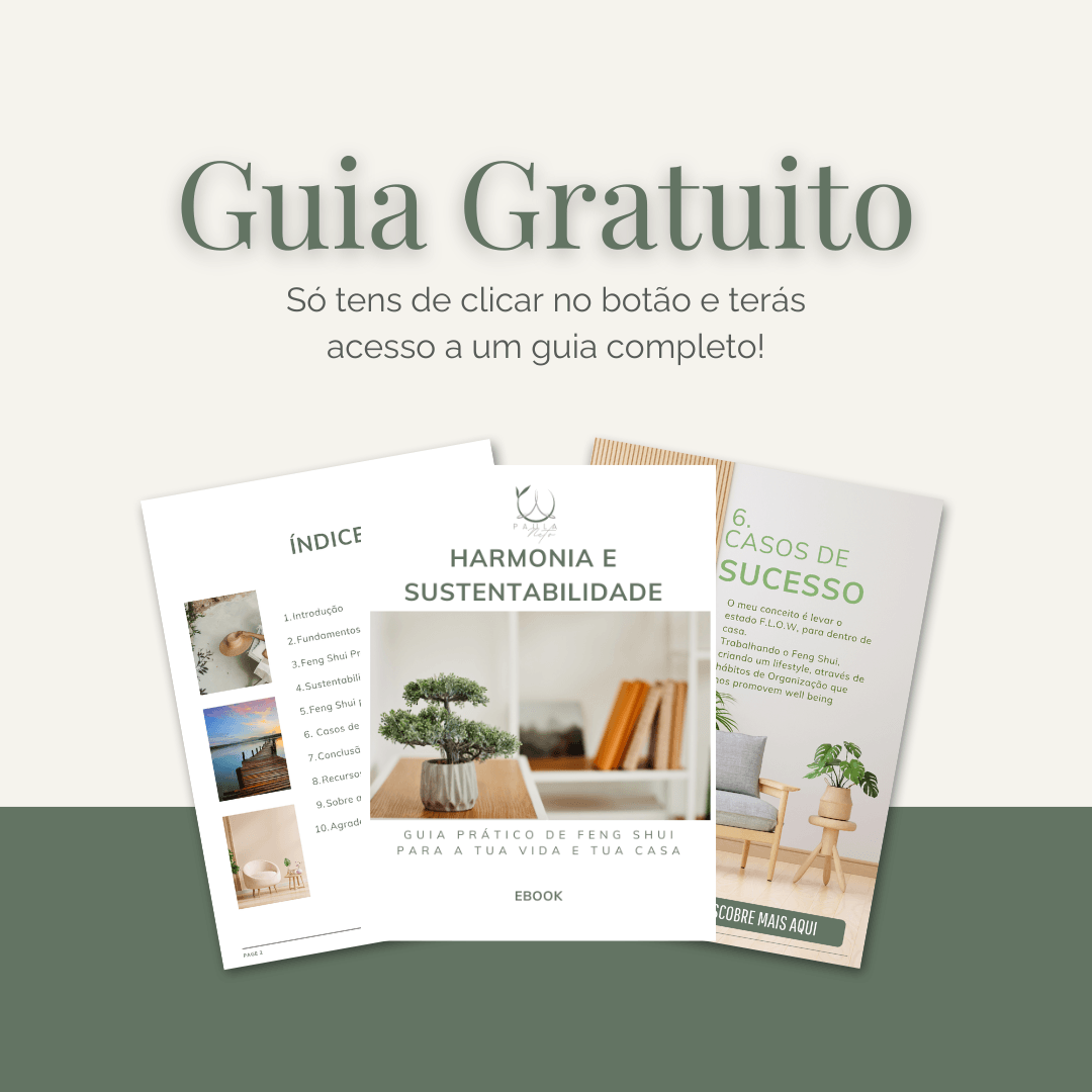 Então este eBook é para ti: um guia simples e transformador para começares hoje mesmo a harmonizar a tua vida com Feng Shui e Sustentabilidade. Descobre como criar uma Vida FLOWida – mais leve, organizada e em harmonia contigo e com o planeta.